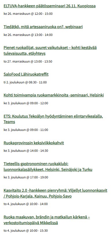 Ilmoitathan omista tapahtumistasi paivi.toyli@helsinki.fi hyvissä ajoin, niin saadaan siten vältettyä päällekkäisyyksiä ja tiedotettua tapahtumista muun muassa Ruokasektorin koordinaatio tiedottaa -uutiskirjeen lopussa. Noin viikoittain ilmestyvän uutiskirjeen voit tilata Päiviltä.