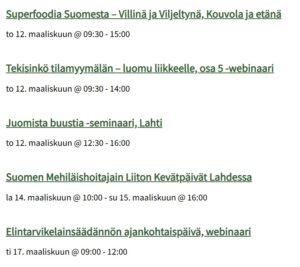Ilmoitathan omista tapahtumistasi paivi.toyli@helsinki.fi hyvissä ajoin, niin saadaan siten vältettyä päällekkäisyyksiä ja tiedotettua tapahtumista muun muassa Ruokasektorin koordinaatio tiedottaa -uutiskirjeen lopussa. Noin viikoittain ilmestyvän uutiskirjeen voi tilata Päiviltä.